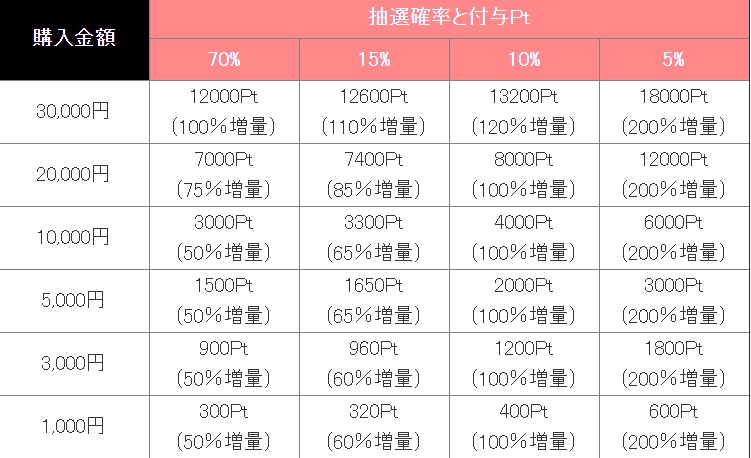 1,000円で200ptが基本で、これに購入特典として増量分が付くのだが、これが増える。