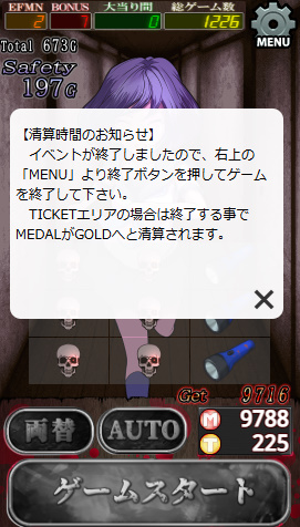 9788メダル獲得! 使用チケ22、ボーナス中197G残しで時間切れ勿体ない... 設定6券が珍しく仕事しました