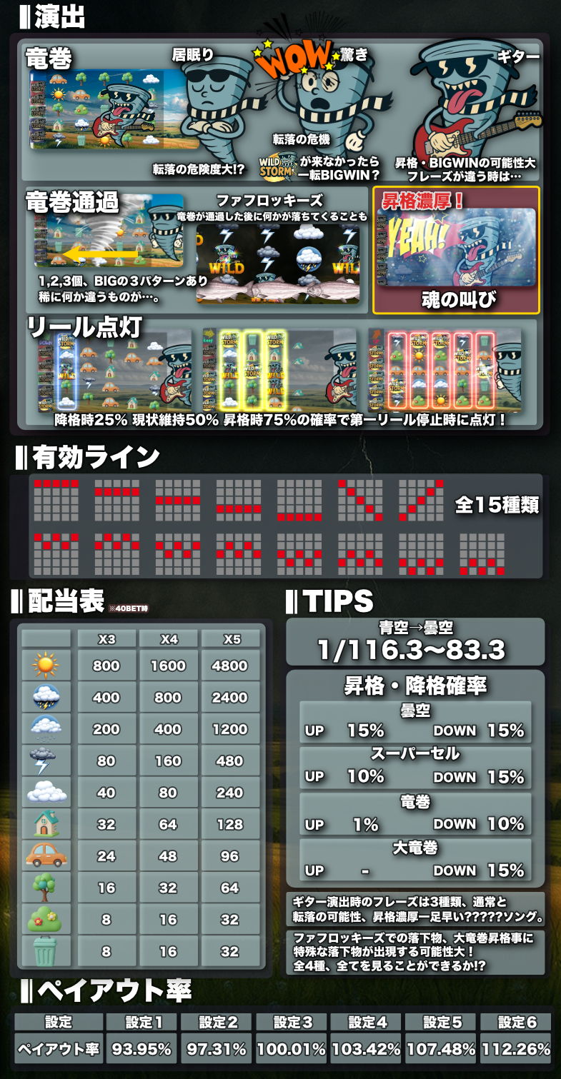 「WILD STORM」では1回のゲームで10枚/20枚/40枚のスロットコインをベットすることができ、対応するラインに各絵柄が揃うと払出しを受けることが出来ます。