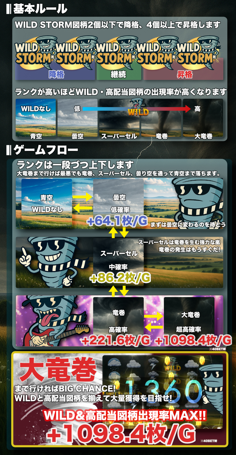 「WILD STORM」はMAXベット専用機です。10枚/20枚/40枚の3種類の台からお選び頂けます。